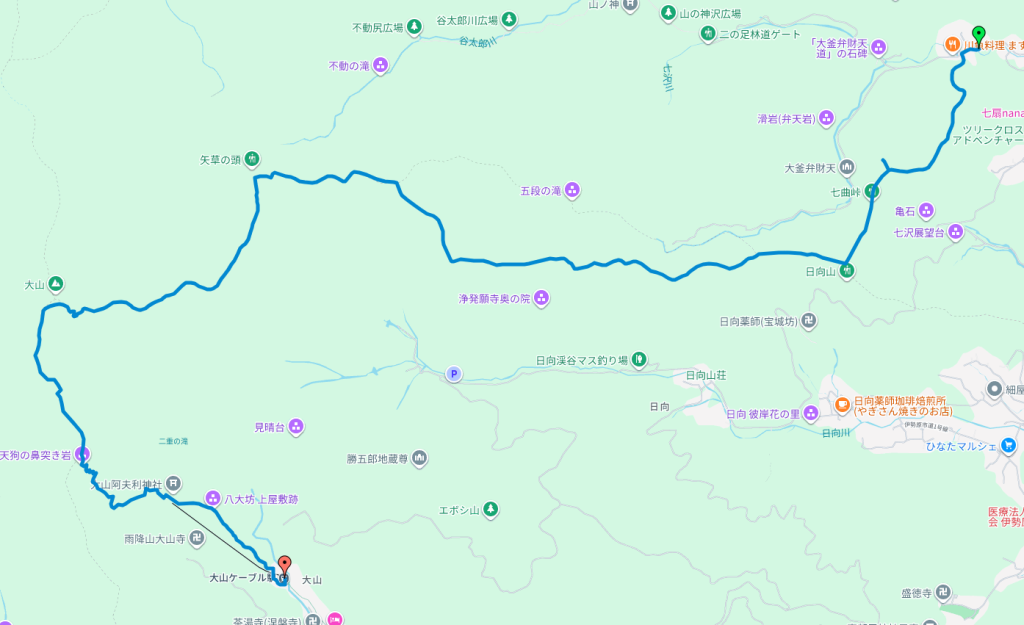 コース: 広沢寺温泉 → 見城山 → 七曲峠 → 日向山 → 天神峠 → 二ノ沢ノ頭 → 鍵掛 → 梅の木尾根分岐 → 不動尻分岐 → 大山 → 阿夫利神社下社 → 大山ケーブル駅