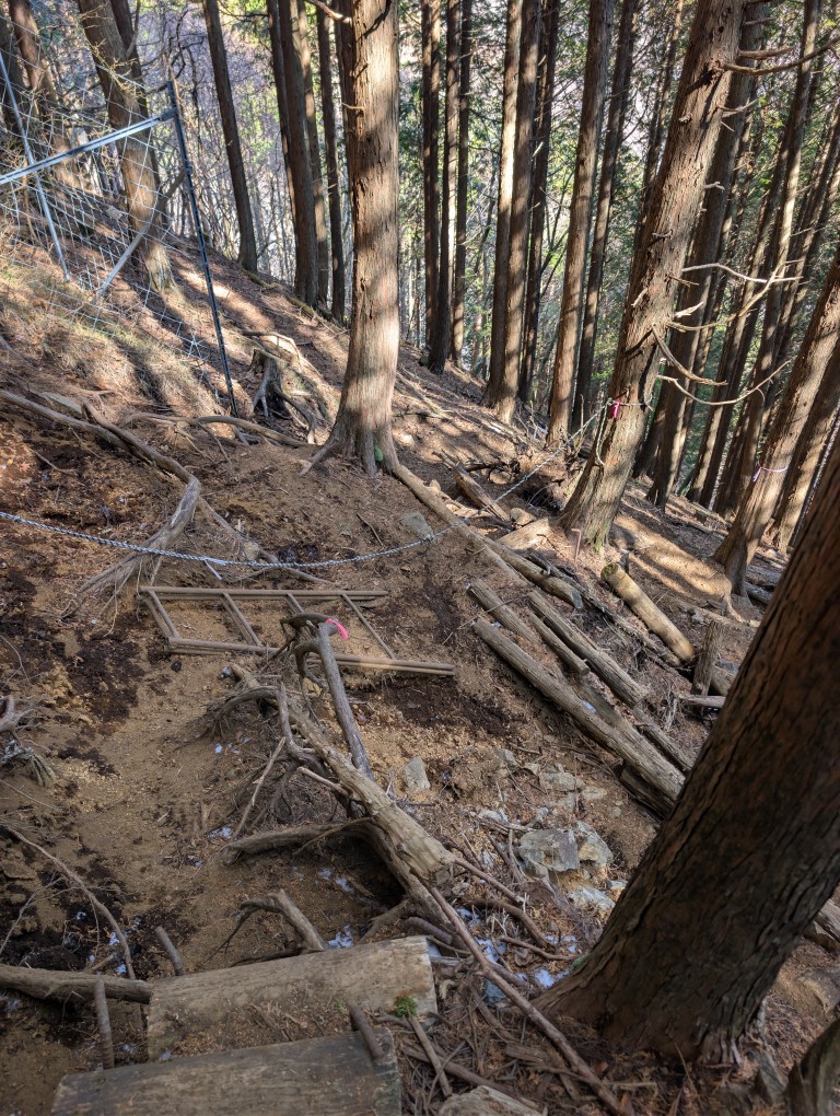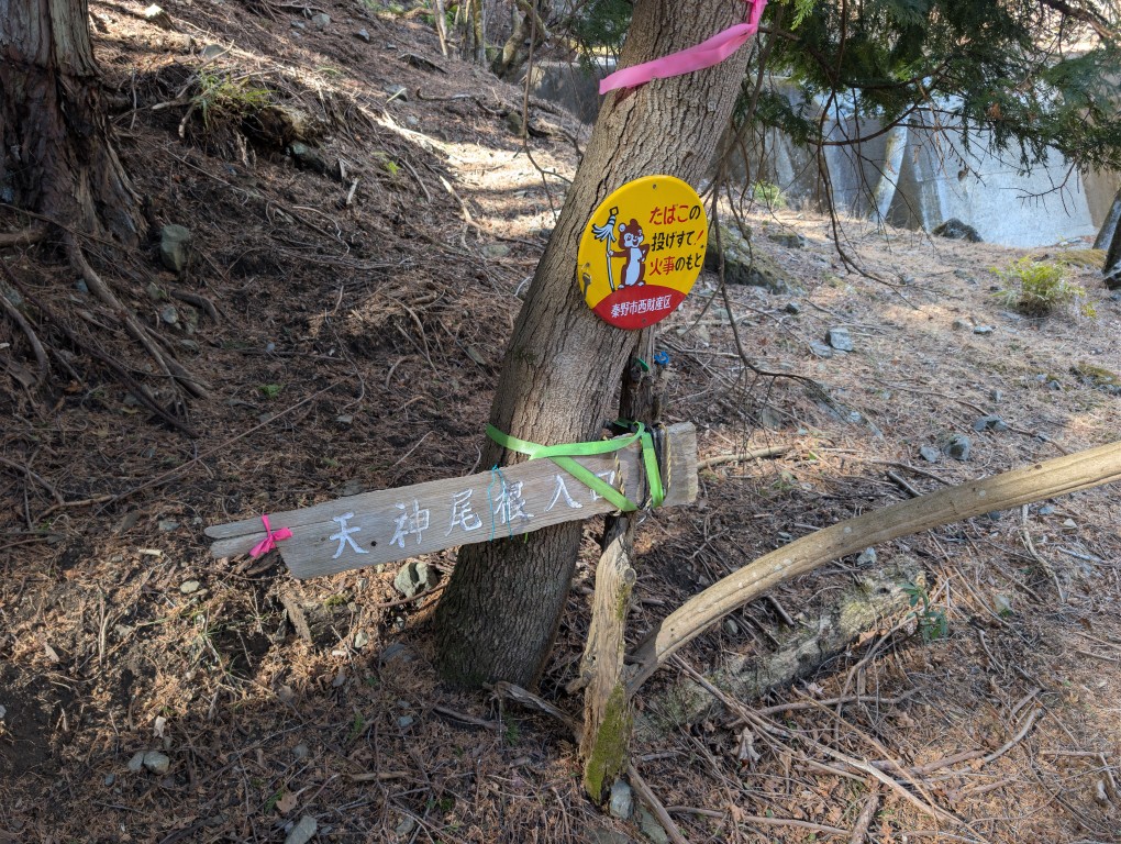 天神尾根は、一般的な登山道を想像して入ると戸惑う。登山道は不明瞭で荒れており、ピンクテープを頼りに進む場面が多い。足元は不安定で、集中力を欠くと一気にリスクが高まる。