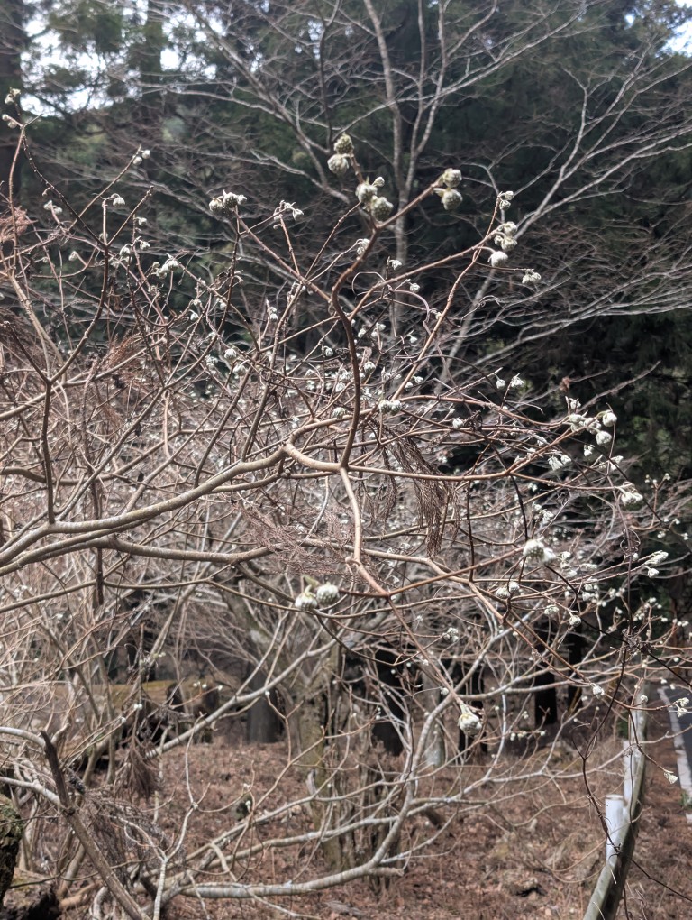 途中、岩が点在する場面もあるが、慎重に歩けば問題ないレベルだ。1月にもかかわらず、ミツマタのつぼみが膨らみ始めているのが印象的だった。季節は確実に先へ進んでいる。