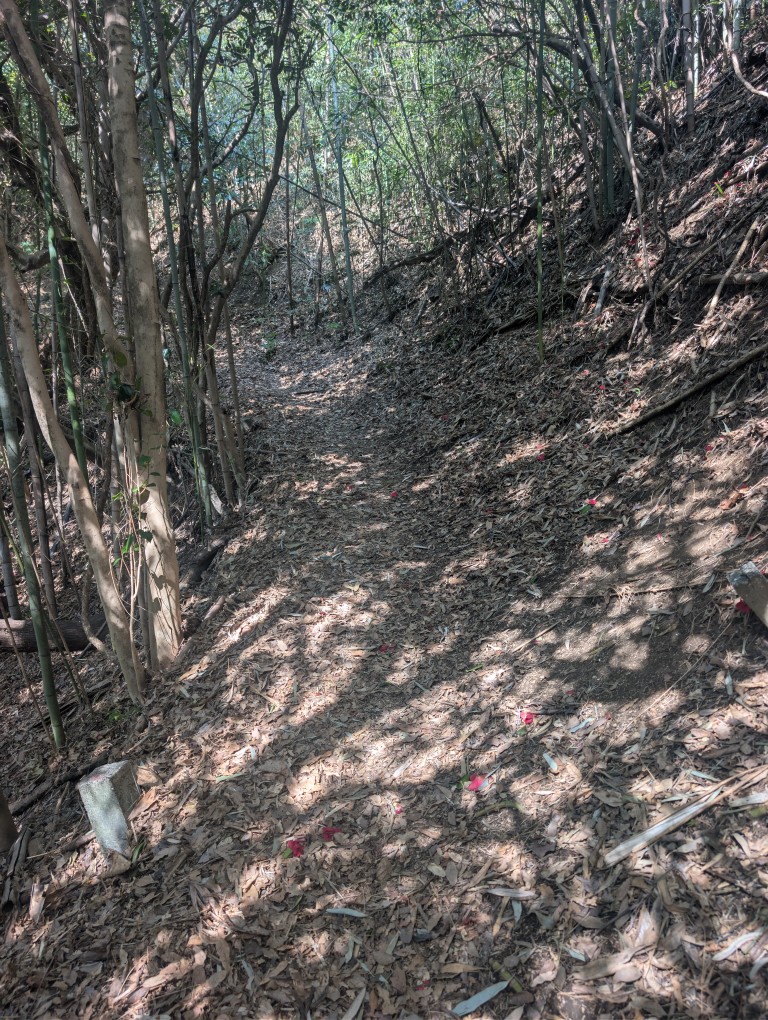 序盤は住宅地と隣接した緩やかな登り。峯山、桔梗山とピークを踏むが、いずれも「登った」という感覚は薄い。標高ではなく、あくまで通過点だ。
